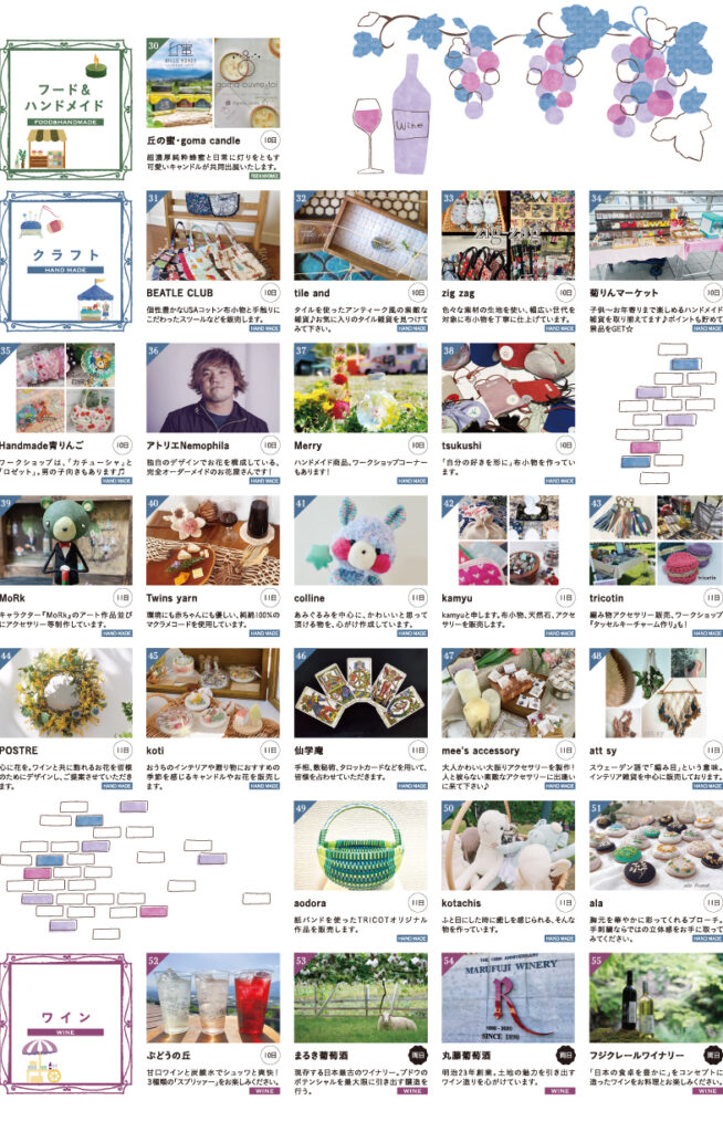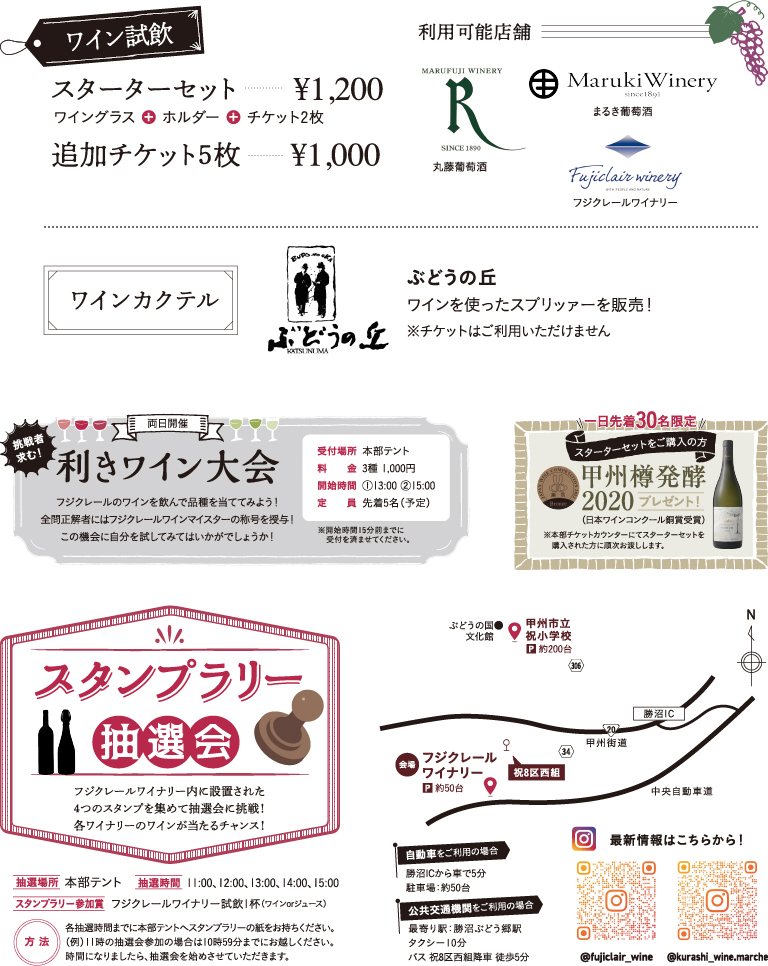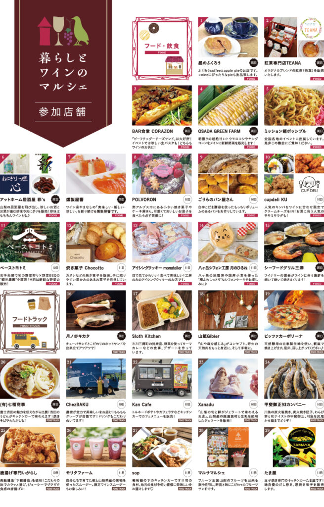 2023.5.292023.6.12に投稿 【暮らしとワインのマルシェ】おいしいマルシェを6月に開催! ワインは日常に彩を加えてくれる飲み物。同じように日常を豊かにするモノは私たちの生活に数多く存在します。今回はおいしいマルシェ!食べて飲んで買い物して!皆様の生活を彩るイベントになりますように。 ※画像をクリックするとパンフレットをご覧いただけます。 暮らしとワインのマルシェ パンフレットの埋め込み。">暮らしとワインのマルシェ パンフレットダウンロード こちらの記事もおすすめ 【暮らしとワインのマルシェ】秋の大収穫祭を11月に開催! 暮らしとワインのマルシェ in 山梨 『暮らしとワインのマルシェvol.1』 開催レポート 『暮らしとワインのマルシェvol.2』開催レポート 安全とさらなる発展を願って『仕込み式』 12/3(土)◆CAMP WINe TRIP◆冬の西湖を堪能するキャンプとワインの旅イベント 投稿ナビゲーション前の投稿: フランスのワイン国際コンクール「フェミナリーズ」にて金賞をダブル受賞!フジクレール 「マスカット・ベーリーA隼山2020」「ヴィ・ルフレ2019」次の投稿: LADY beetle(レディビートル) – 大自然で味わう究極の野遊びワイン