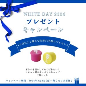 お会計金額1万円(税込)以上ご購入いただいたお客様に、シリコン製ワインボトルキャップをプレゼント。飲みきれなかったワインをしっかり保存することができる、優れものです。 キャンペーン対象:お会計金額1万円(税込)以上ご購入いただいたお客様プレゼント内容:シリコン製ワインボトルキャップご注意点:①先着1 […]